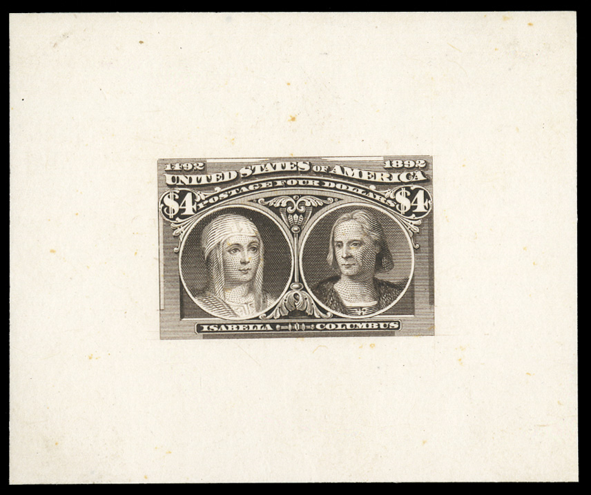 (244-E8) 1893 $4 black brown, die essay on india on card, 70x58mm, h.r. and pencil notations on back, some very faint toned spots, v.f. and seldom seen essay, cat. $2,000
