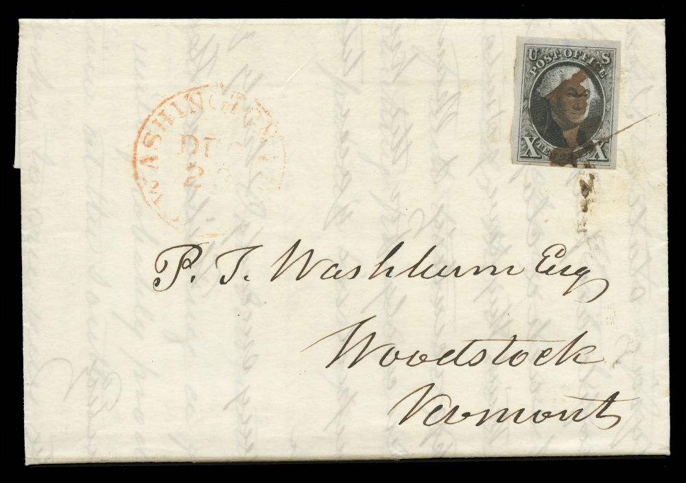 (2) 1847 10c black, wide margins on all sides, tied by a manuscript pen cancel on a FL datelined December 21, 1850, red Washington D.C. Dec 23 cds at left, addressed in the hand of Hiland Hall to Peter T. Washburn in Woodstock, Vt., contents include a complete three-page letter written by Hall, offe