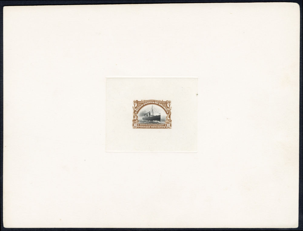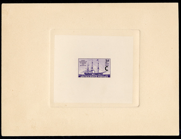 (923P) 1944 3c "Savannah" (First Steamship Across Atlantic), large die proof in issued color, die sunk on card (200x150mm), with "C" punch at right, handstamped on reverse "Engraver''s stock proof/ Authorized by" and signed by the engraver, Serial No. 819219A, v.f.