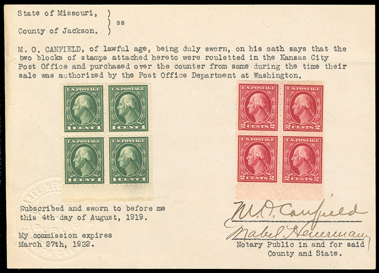 (408-409var) 1912 Kansas City Roulette, 1c and 2c sheet margin blocks of four, affixed to 1919 sworn notarized statement by M.O. Canfield which states that they were purchased over the counter in Kansas City, MO., v.f. and interesting item