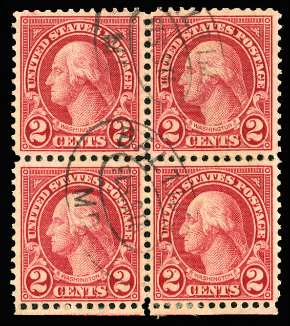 (595) 1923 2c carmine, bottom sheet margin block of four, used, fairly well centered, fine-v.f. A rare block, cat. $1,750