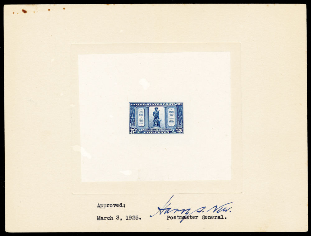 (617-619P1) 1925 Lexington-Concord, large die proofs, die sunk on full cards (203x153mm), each with Harry New postmaster general approval signature, blue control numbers on back, 5c with minor toning at top left of card, well away from the proof, v.f., scarce set of large die proofs, cat. $9,000