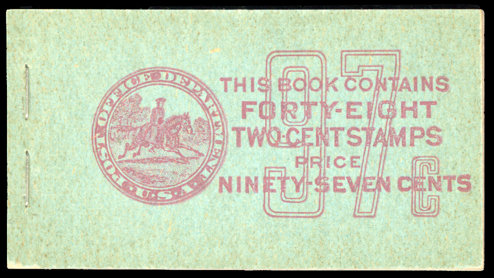 (38b) 1912 1c green & black, complete booklet pane of six, disturbed gum, stitched with back cover, glassine interleaves and top pair of the adjoining pane, plus detached front cover, scarce, cat. $575