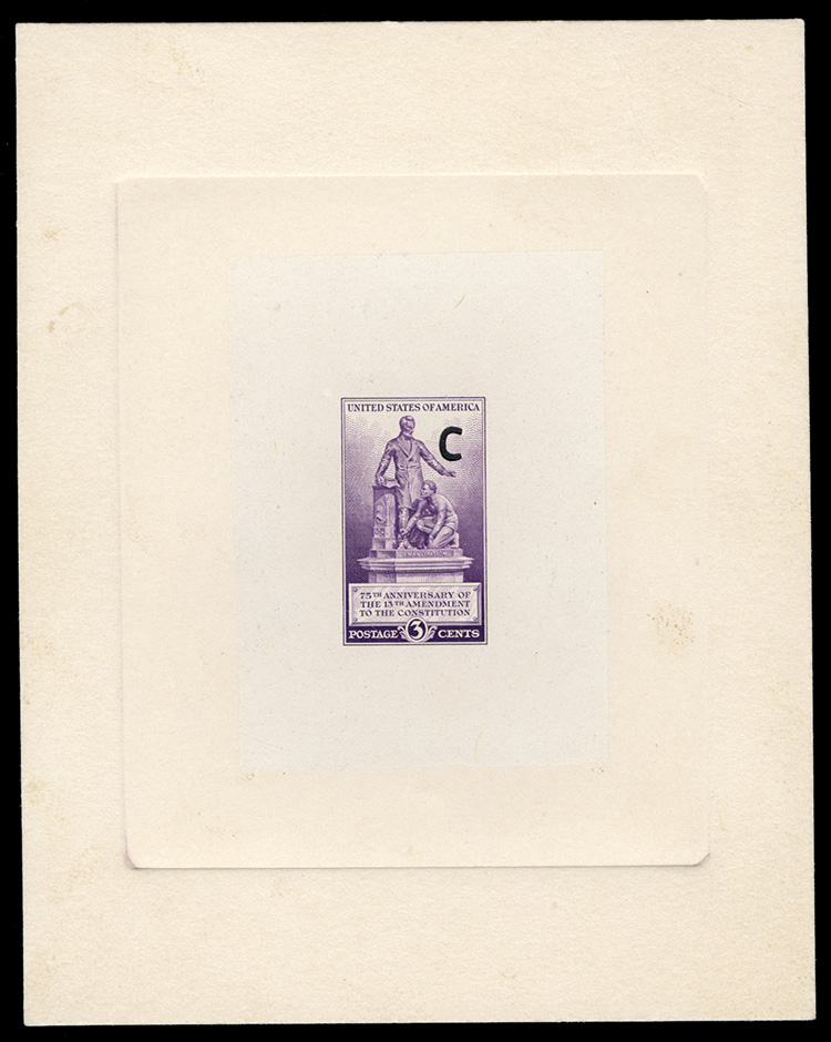 (902P) 1940 3c Emancipation Monument, large die proof in issued color, die sunk on card (116x146mm), with "C" punch at right, handstamped on reverse "Engraver''s stock proof/ Authorized by" and signed by the engraver, Serial No. 659128A, v.f.