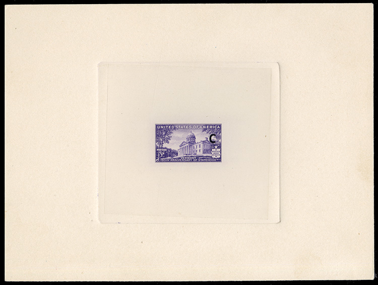 (903P) 1941 3c Vermont, large die proof in issued color, die sunk on full card (202x150mm), with "C" punch at right, handstamped on reverse "Engraver''s stock proof/ Authorized by" and signed by the engraver, Serial No. 674259A, v.f.