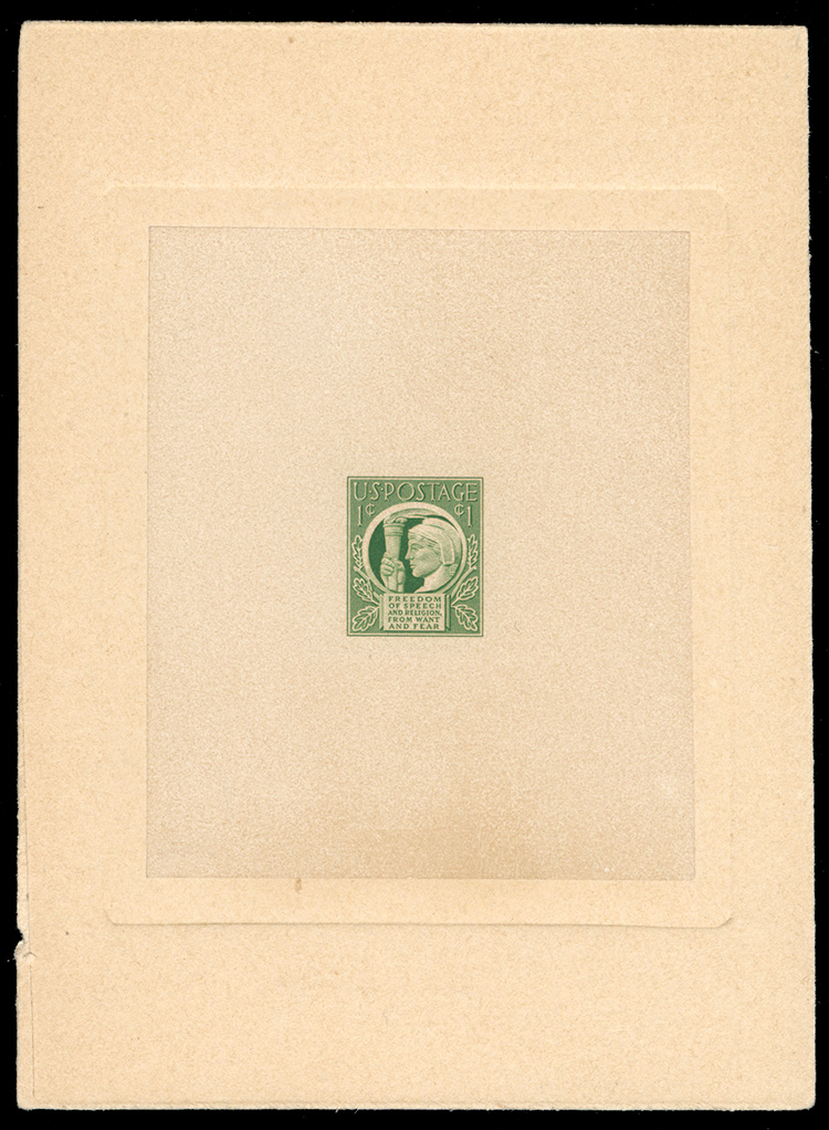 (908P) 1943 1c Four Freedoms Issue, large die proof in issued color, die sunk on card (110x150mm), handstamped on reverse "Engraver''s stock proof/ Authorized by", signed, with Serial No.762733A, v.f., probably unique