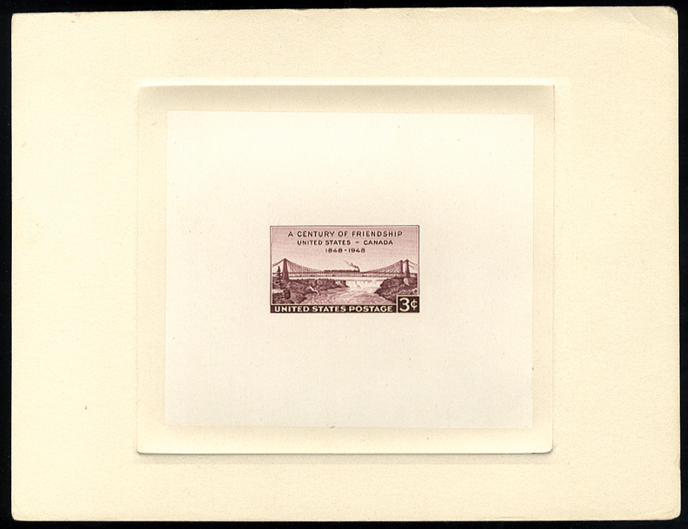 (961TC1) 1948 United States-Canada Friendship Issue, 3c trial color large die proof in brown violet, die mounted on card (202x156mm), with blue control no. and engraver''s stock proof handstamp on reverse, v.f. and rare unlisted die proof
