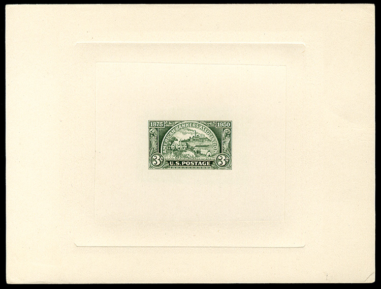 (987TC1) 1950 American Bankers Association, 3c trial color large die proof in green, die mounted on card (202x152mm), with blue control no. and engraver''s stock proof handstamp on reverse, minor corner bend, v.f. and rare unlisted proof
