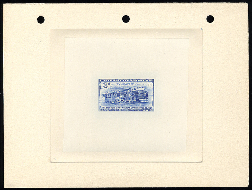 (1006TC1) 1952 B. & O. Railroad, 3c trial color large die proof in blue, die mounted on card (202x152mm), with blue control no. and engraver''s stock proof handstamp on reverse, v.f. and rare,1750