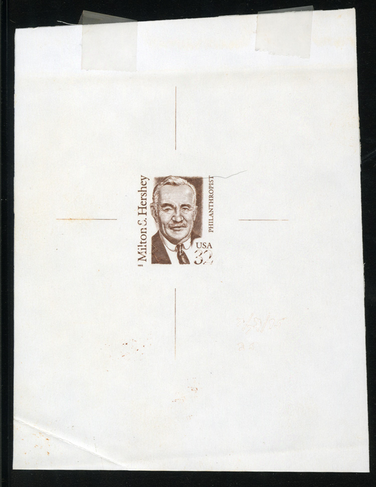(2933P) 1995 Milton Hershey, 32c die proof on gummed paper, guide-line markings on all sides, creases and scotch tape stains on top, fine and undoubtedly very rare