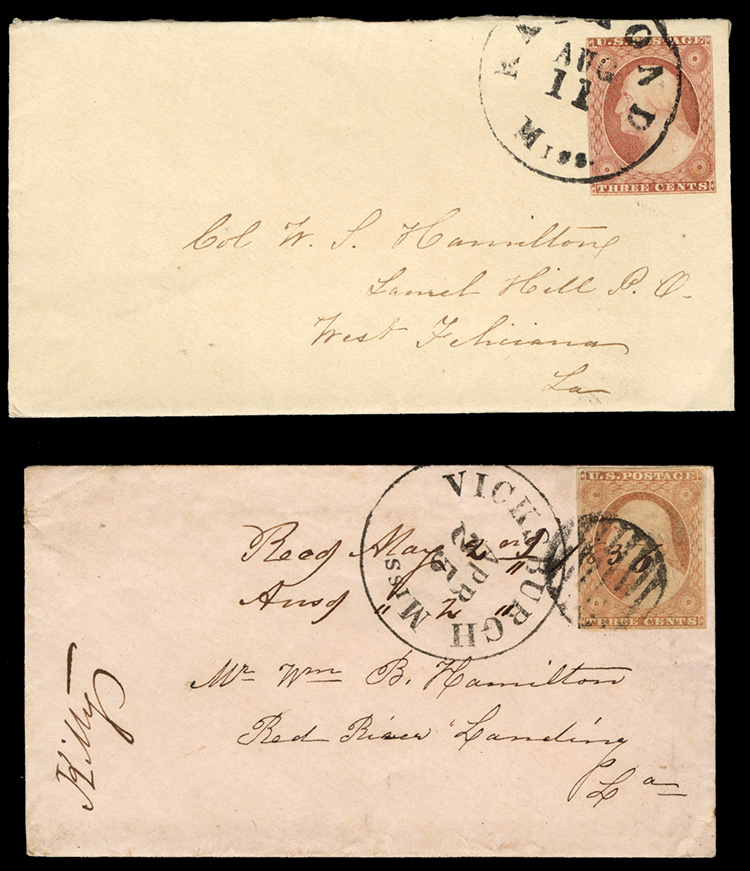 1851 two small covers, each with 3c red brown franking, used from Vicksburg, Miss. (Apr 25) and Raymond, Miss. (Aug 11) to Col. W.P. Hamilton in Louisiana