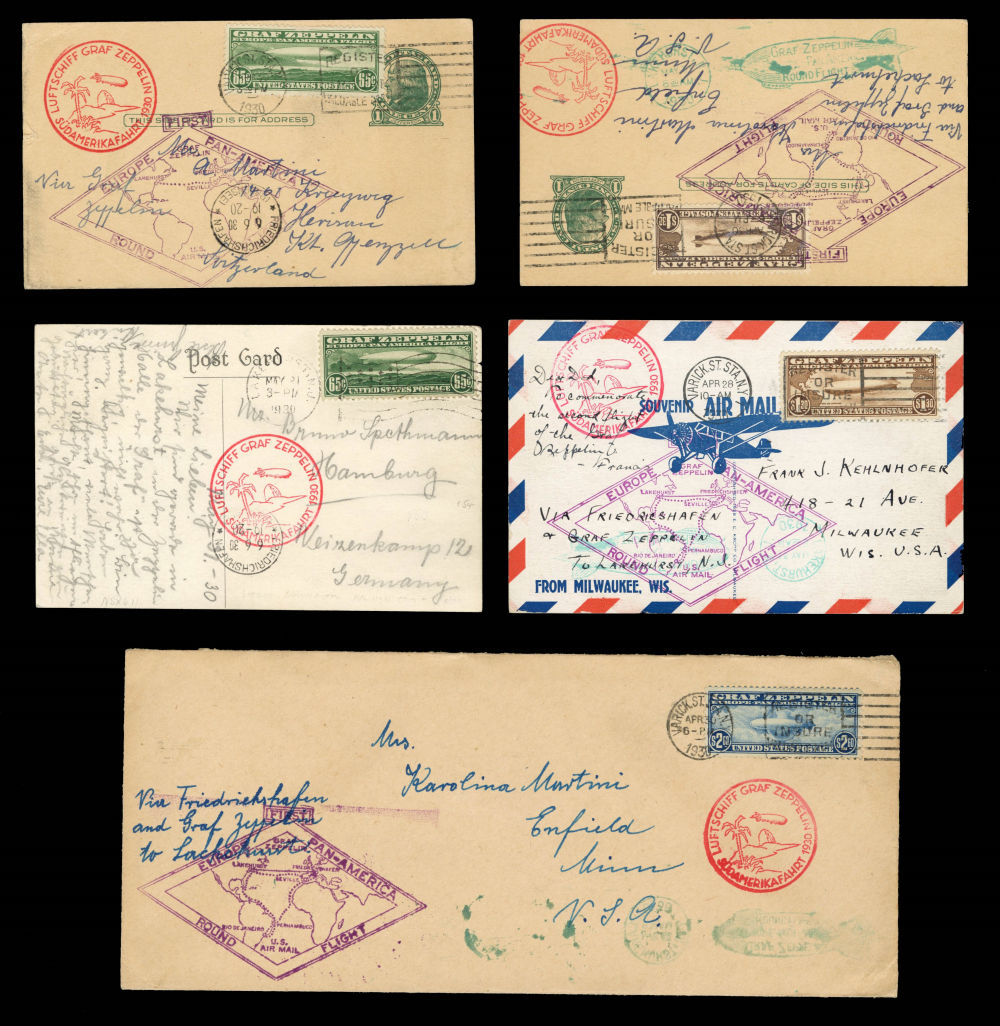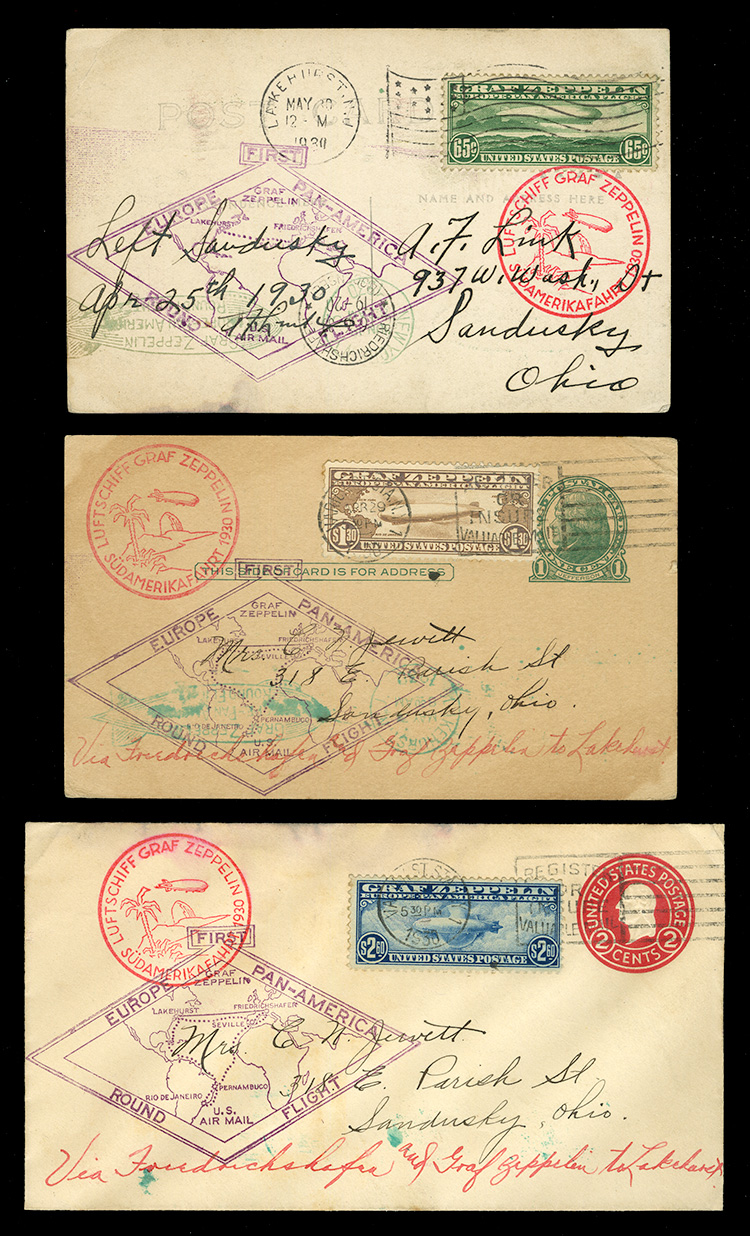 (C13-15) 1930 Zeppelin, 65c-$2.60, set of three used on ppc (65c), 1c stationery card ($1.30) and 2c entire ($2.60), all appropriate cachets and markings, some toning, otherwise fine, cat. $1,155