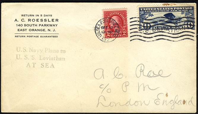 1927 (10 Sep) U.S. Sea Post Office with "U.S.Navy Plane to U.S.S. Leviathan at Sea" cachet, return address of A.C.Roessler, some toning, stamps with small faults, otherwise fine