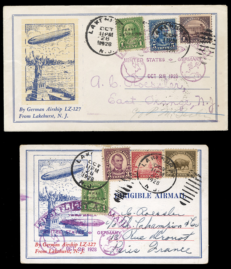 1928 (28 Oct) Albert Roessler cacheted LZ-127 cover, franked with 1c green, overprinted "Graf Zeppelin" (small "A" in "Graf"), also 5c Roosevelt and $1 Lincoln Memorial, Lakehurst departure and Friedrichshafen arrival pmks. Also included is a cacheted ppc with 1c green, similar "Graf Zeppelin" (larg