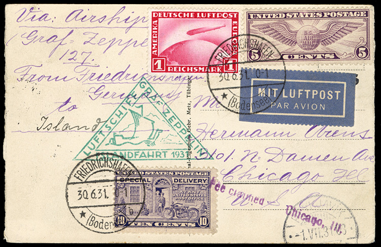 1931 Iceland Flight, picture postcard from Friedrichshafen, with U.S. 5c and 10c (Special Delivery), used in combination with Germany 1m carmine, tied by 30.6.31 departure pmks, Reykjavik (1.VII.31) arrival cds at lower right, with Chicago (July 16) pmk on picture side, fine and interesting item