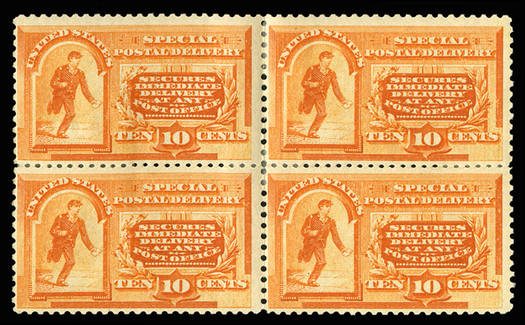 (E3) 1893 10c orange, block of four, hinge strengthening and pencil notations, fine,1250