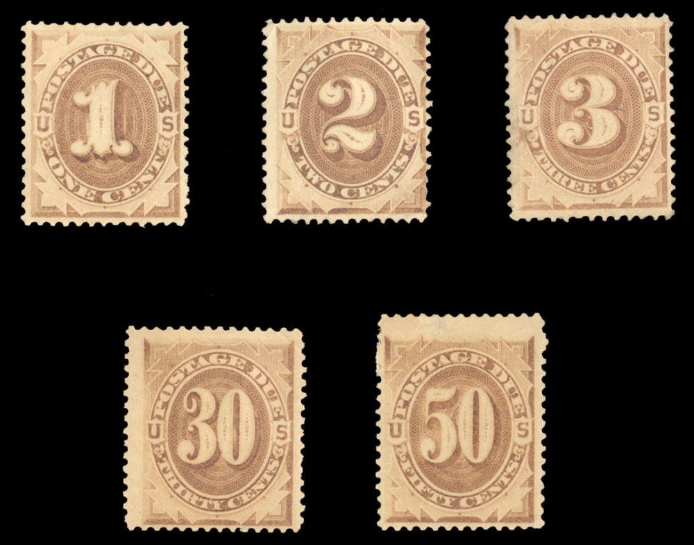 (J1-3,6,7) 1879 1c, 2c, 3c, 30c and 50c brown, l.h. or h.r., 2c without gum, others well centered, fine-v.f., cat. $1,700
