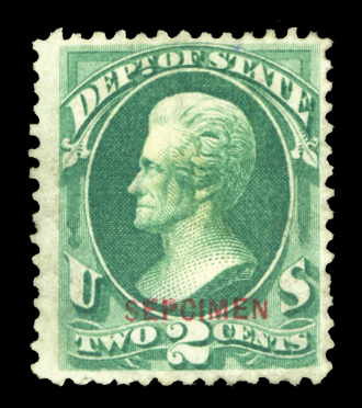(O58Sa) 1873 Special Printing, Department of State, 2c bluish green, overprinted "SEPCIMEN" in error, without gum as issued (paper adherence on reverse), fresh color, fine example of this rare stamp, with 2017 PFC, cat. $2,500
