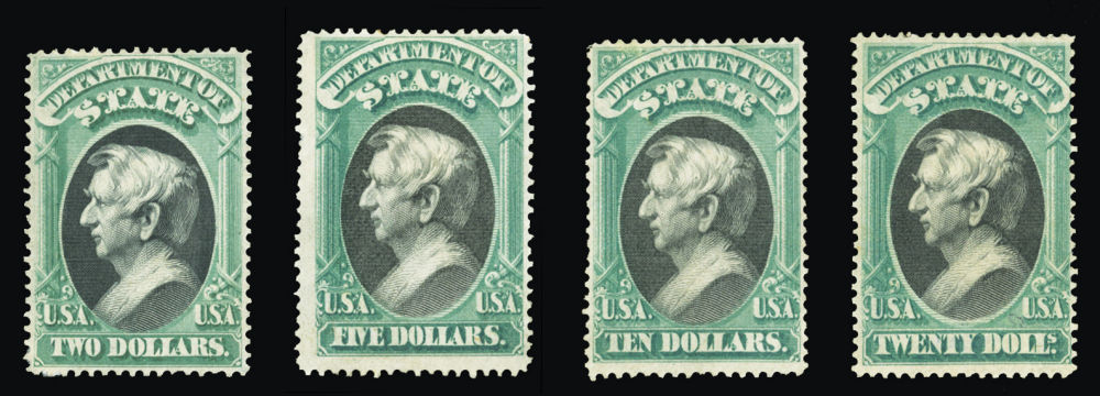 (O68-71) 1873 State, $2-$20 green and black, four top values, $2 and $10 unused without gum, reperforated (the latter regummed over faults), others part original, disturbed gum, minor thin spots or shorter perforations, good colors, fine group of $2, $5, $10 and $20 Department of State Revenues, wit