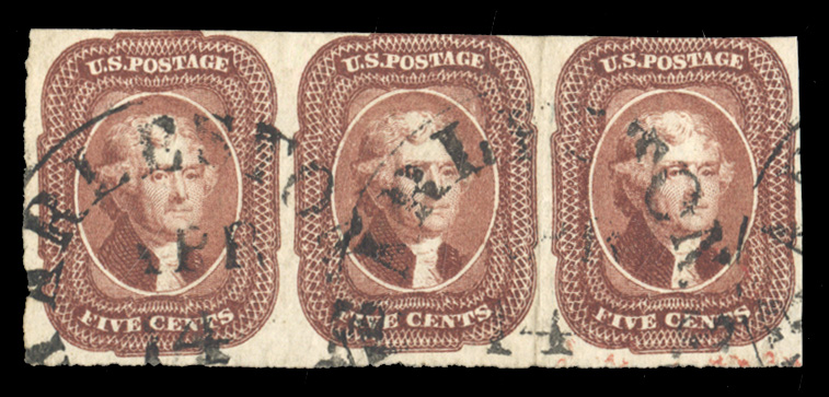(12) 1851 5c red brown, horizontal strip of three, black Charleston Apr 14 town cancels, part of red arrival at bottom right, margins just clear at left stamp, right pair in at top, faint crease between stamps, still a fine multiple, cat. $3,750