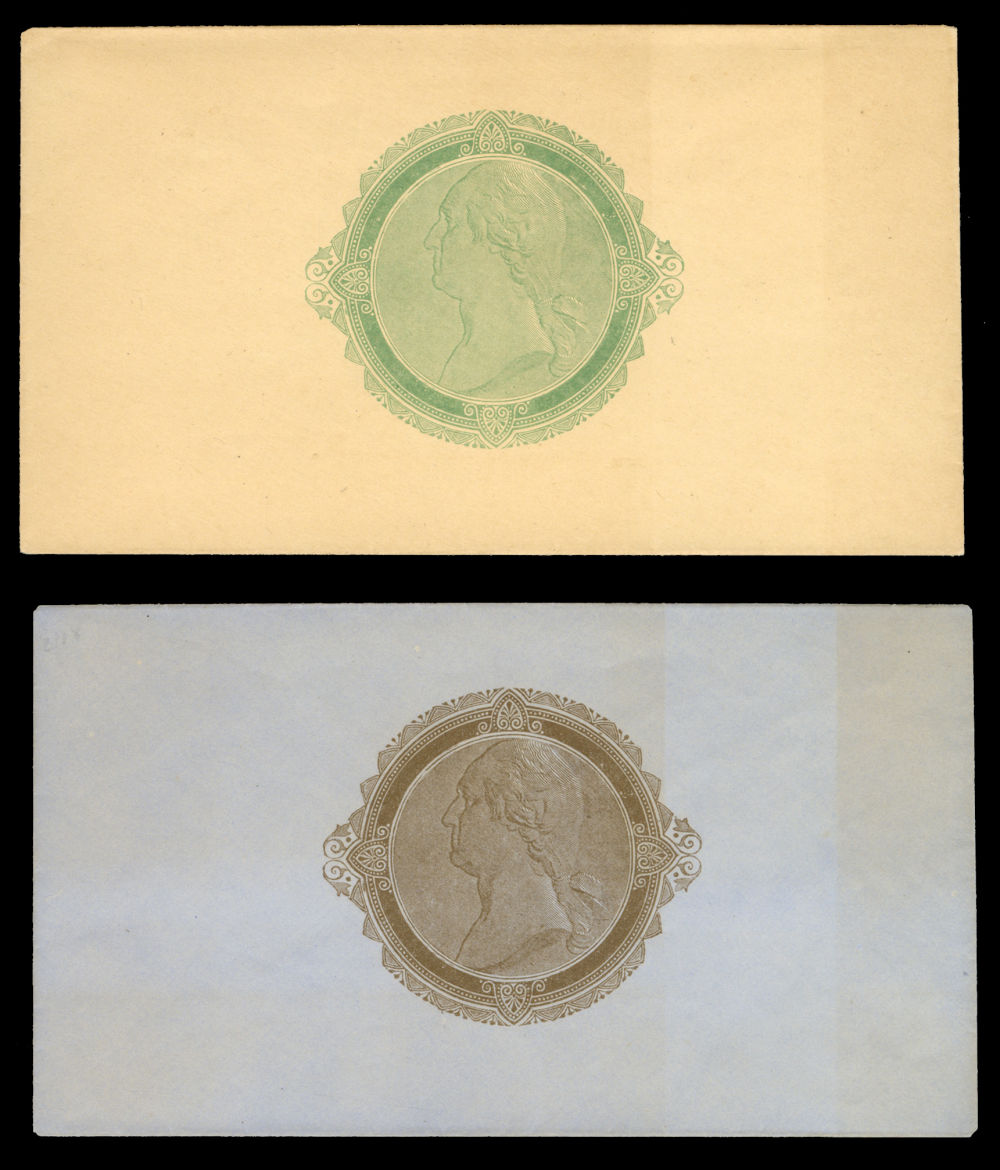 1874 Lockwood and Company, Washington design in center of non-denominated entire envelopes, in light green and bluish brown, unused, minor toning, fine-v.f., interesting
