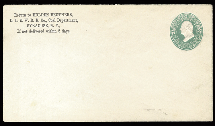 (U168) 1881 3c green, die 58, size 10, knife 54, unused entire, with pre-printed "Holden Brothers" return address, backflap partly sealed and the entire opened at top, otherwise v.f. and rare (UPSS 449, only four unused, unaddressed entires recorded, all with defects, 2009 PFC, cat. $2,250