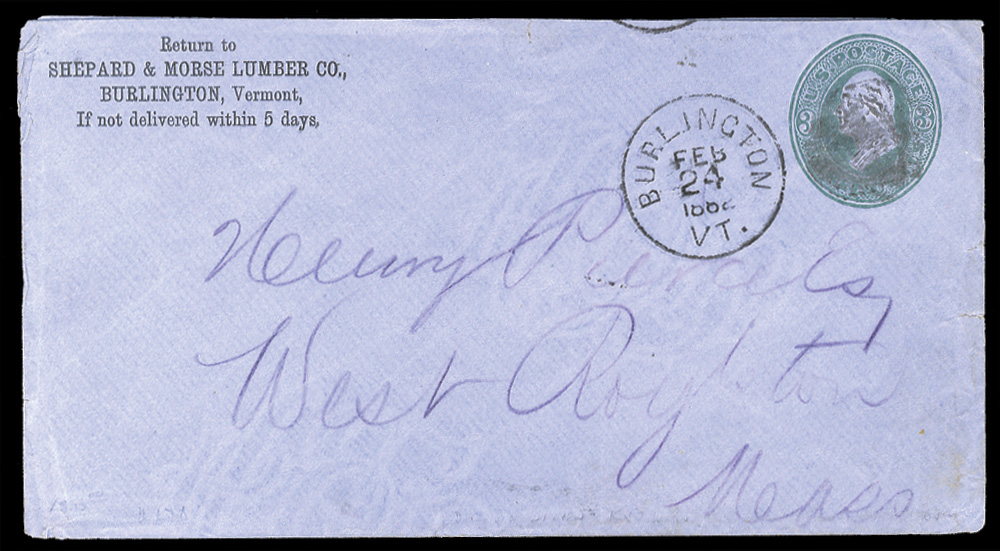 (U170) 1881 3c green on blue, entire, size 10, knife 54, watermark 5, cork cancel, with "Burlington, VT Feb 24 1882" cds alongside, addressed to West Royton, MA, with preprinted address at upper left, few insignificant edge tears, otherwise v.f. and rare used entire, approximately 15 exist in additi