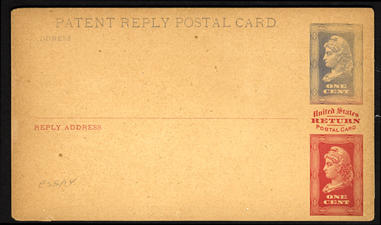 1900 Patent Reply unused postal card Essay, 1c gray blue and red, some toning, with back label detached, fine