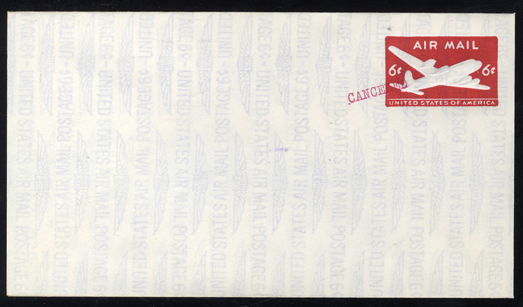 (UC25E) 1960-70 6c Airmail envelope Essay, vertically imprinted "United States Air Mail Postage 6c" (every other line with inverted wording), fully imprinted inside (mirror image) in violet, indicia handstamped "Canceled", outside borders omitted (Undersander EAM8Ea, $1,500)