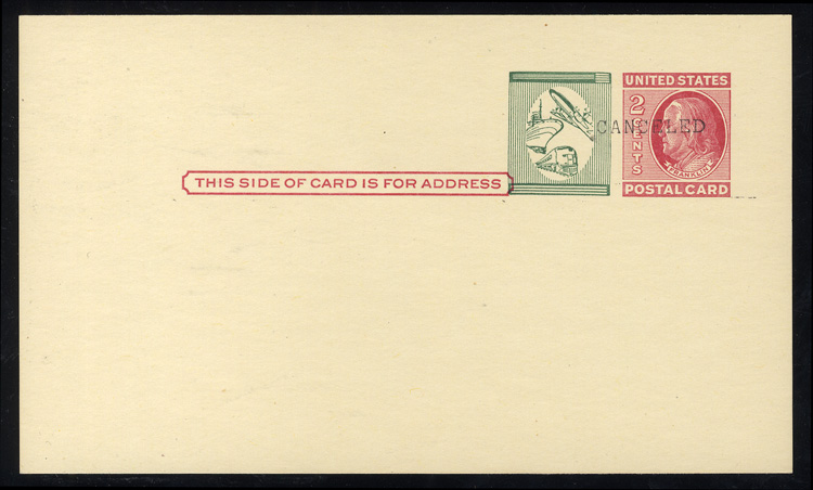 (UX38E) 1960-70 2c carmine rose, with 1c green Plane, Train and Ship surcharge essay without denomination or "U.S. Postage" label, overprinted "CANCELED" in black, v.f. and rare