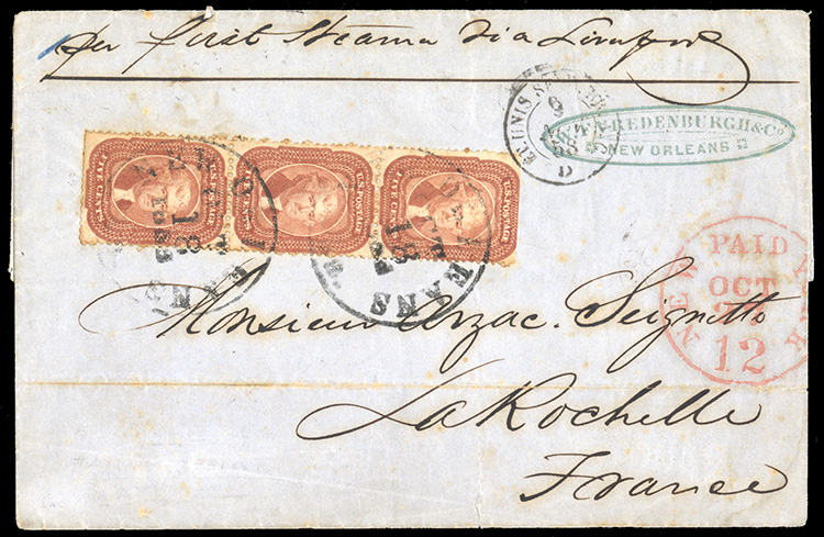 (28) 1857 5c red brown, vertical strip of three, perfs cut at top, tied by New Orleans departure pmks on outer FL from New Orleans to France, endorsed "per First Steamer via Liverpool", red "New York Paid 12" Oct 27 pmk, minor toning, otherwise fine, with arrival pmk