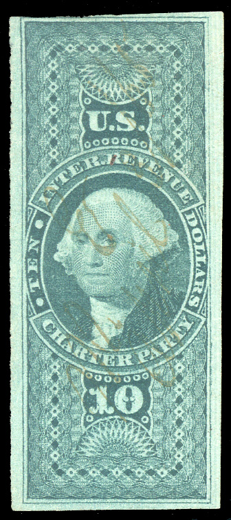 (R93a) 1862 $10 Charter Party, imperf., ms cancel, full to just clear margins all around, fine, with 1997 PFC, cat. $900
