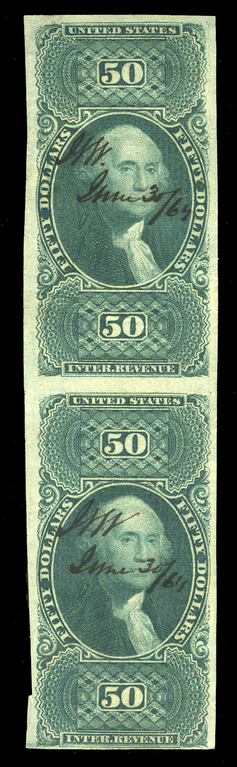 (R101a) 1864 Internal Revenue, $50 green, imperforate vertical pair, ms cancels, v.f., cat. $700