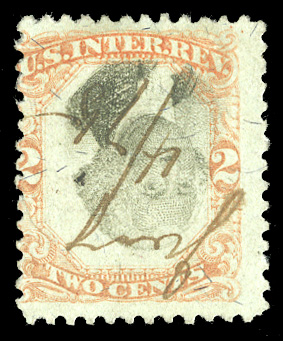 (R133) 1871 $500 red orange, green & black Second Issue “Large Persian Rug” revenue stamp bearing deep, vibrant colors and a light, unobtrusive manuscript pen cancel at center. A light horizontal crease is noted, but the overall visual presentation is v.f. The vast majority of known $500 Second Issu