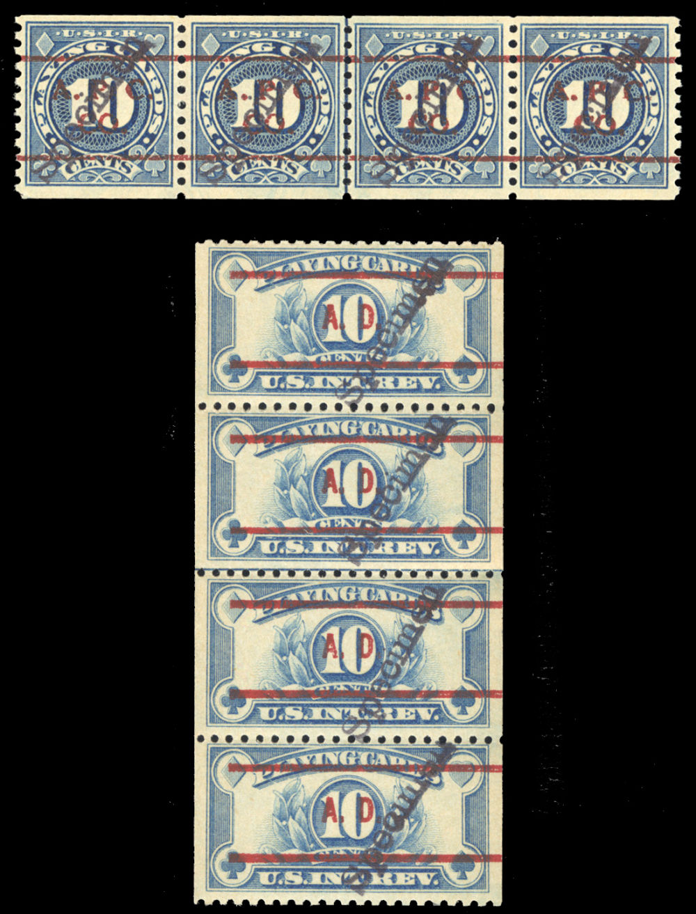 (RF20/23S) 1926-29 10c blue and 10c light blue, overprinted Specimen, horizontal or vertical joint line strips of four, n.h., 10c blue with gripper marks at right, v.f., each with 2014 PSE certificate, cat. $1,000