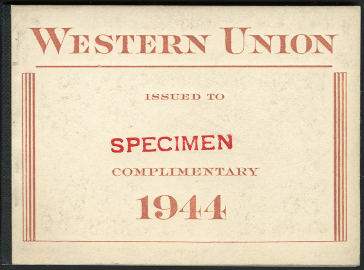 1944 Western Union, unexploded booklet, with red brown "Complimentary" inscriptions on front, with three panes of 9x5c and four panes of 9x25c, each stamp with security punch and overprinted "C" in red, "Specimen" on front, fine and very rare intact Specimen booklet