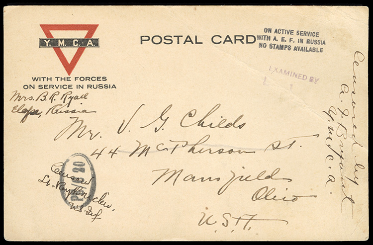 1918 YMCA card (Christmas greetings) to Mansfield, Ohio, printed "With the Forces on Service in Russia", handstamped "On Active Service with A.E.F. in Russia no Stamps Available", violet "Examined by" and British "PE/C20" censor markings, fine and scarce card