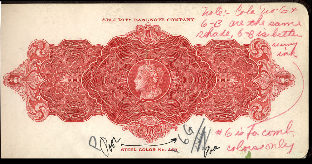 1920 Security Banknote Co. unexploded booklet with 36 different "Steel Colors" engravings, both lithographed and engraved, some corrected by hand with engraver''s notations, brown binder with gold inscriptions, very rare