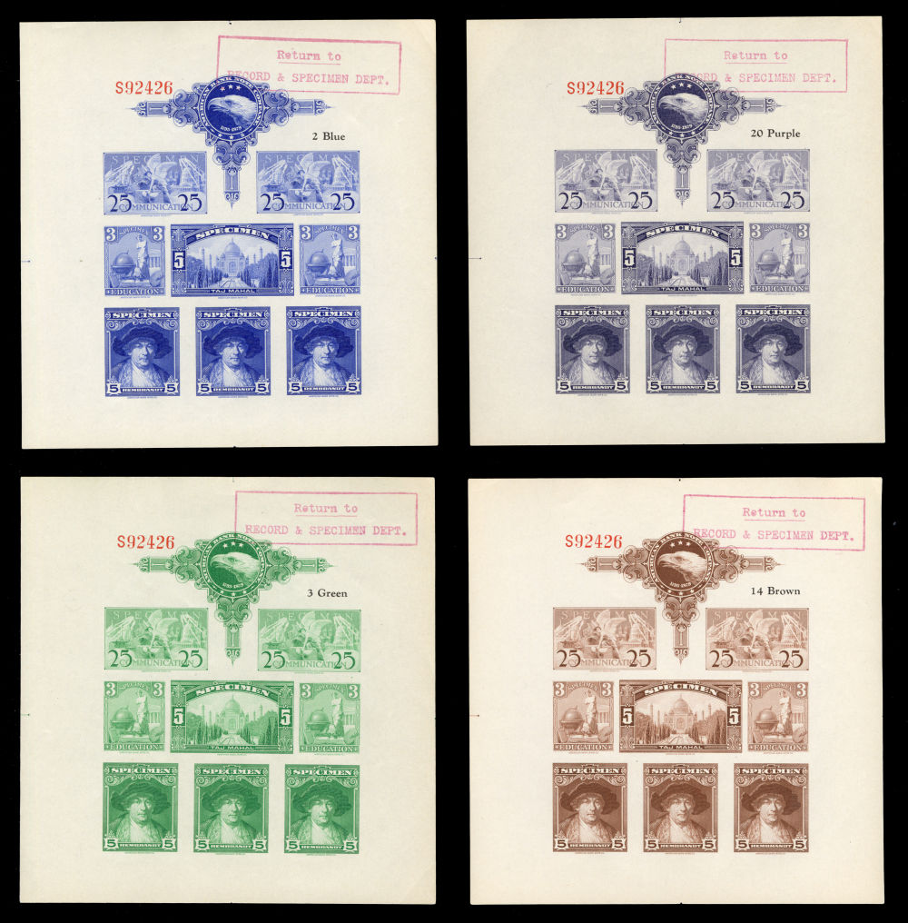 1934 Color Charts, 23 different sheetlets of eight, showing four different designs, various colors noted, each with red handstamp "return to record & specimen dept.", all gummed, few minor faults, mostly v.f. A scarce assembly