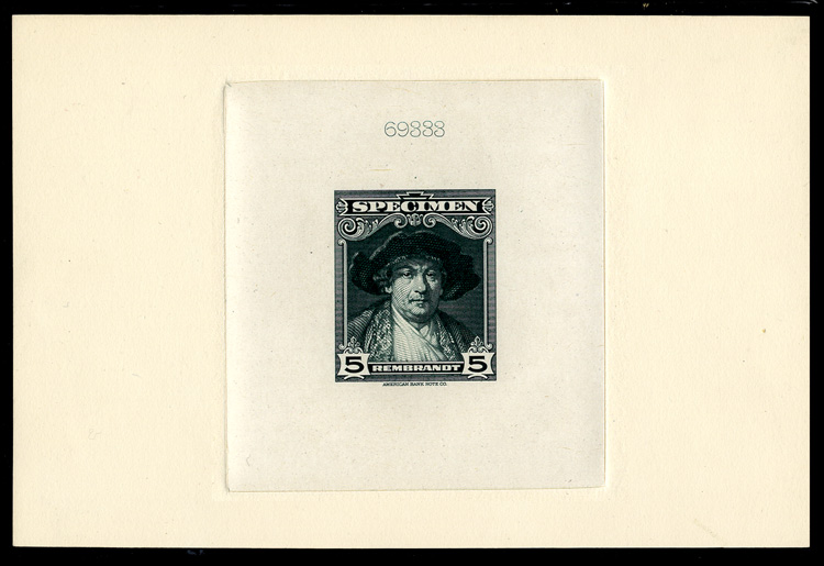 1934 5c Rembrandt, large die proof in green, die sunk on card, v.f.