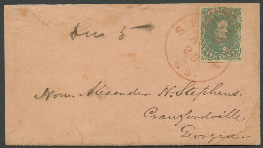 (1) 1861 5c green, single tied by red "Aug 29 Sparta, Ga" cds on cover addressed to Confederate Vice President Hon. Alexander H. Stephens in Crawfordville, Georgia, ms "Due 5" at left; backflap missing, resulting in a piece missing at top left on the front of the cover that has since been profession