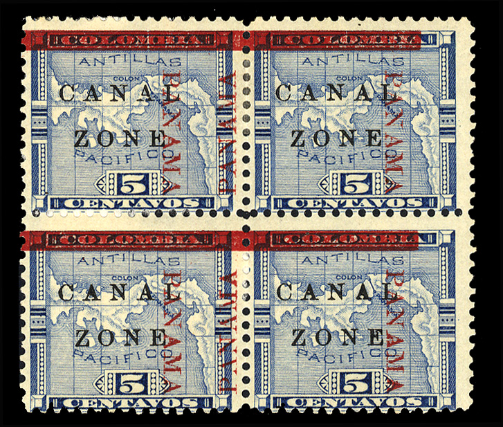 (12var) 1904 5c blue, block of four, with "Panama" shifted left, resulting in right stamps with only one "Panama" and left stamps with two "Panama" close together, reading up and down, heavy adhesions on reverse, still a fine and spectacular variety