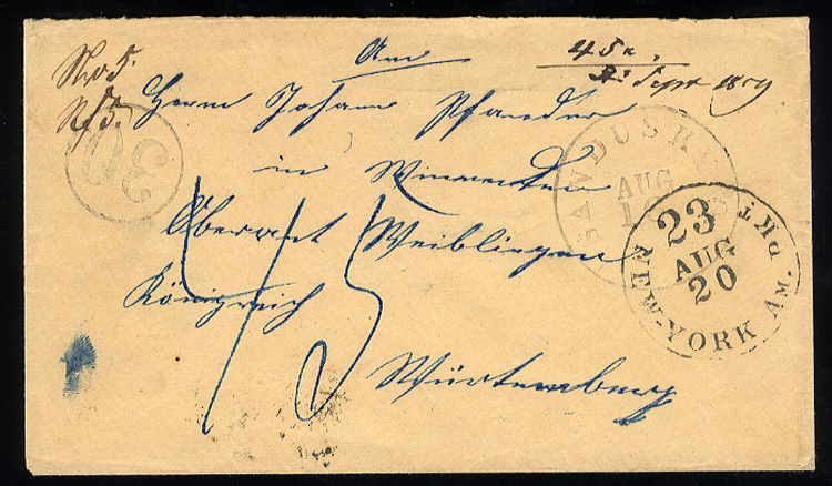 1859 stampless cover from Sandusky, Ohio to Germany, accompanied by a beautifully illustrated lettersheet, cover with New York Am.Pkt transit, Aachen and Stuttgart arrival pmks, large "30" hs and various ms endorsements, fine and attractive cover