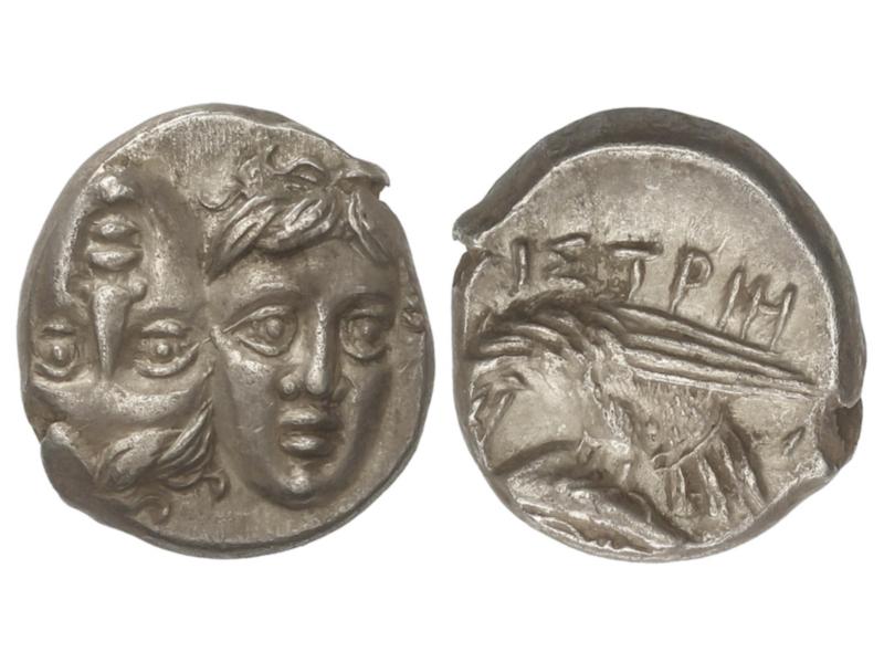 Estátera. 400-350 a.C. ISTROS. Anv.: Dos cabezas masculinas de frente, una derecha y otra invertida. Rev.: Águila a izquierda atacando a delfín, encima leyenda. 5,61 grs. AR. Cospel pequeño. Se-1669. EBC-.