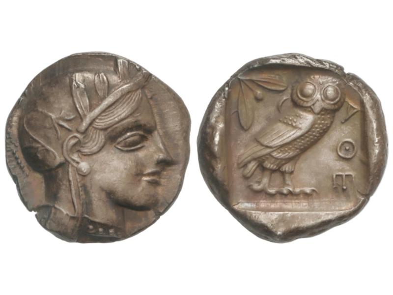 Tetradracma. 454-404 a.C. ATENAS. ÁTICA. Anv.: Cabeza de Atenea a derecha, con casco adornado con rama de olivo. Rev.: AOE. Lechuza en pie a derecha, detrás rama de olivo y creciente, todo dentro de cuadrado incuso. 17,16 grs. AR. Pátina de colección antigua. BUEN EJEMPLA