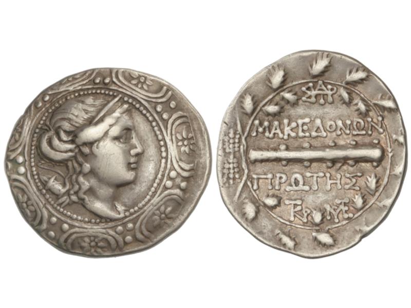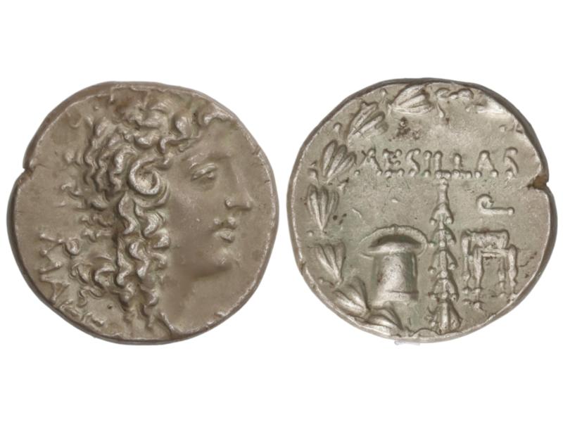 Tetradracma. 93-88 a.C. PROVINCIA ROMANA. AESILLAS como QUAESTOR. MACEDONIA. Anv.: Cabeza de Alejandro Magno con los cuernos de Ammon a derecha. Rev.: AESILLAS. Maza entre hucha y silla de Cuestor, en el campo P tumbada, todo dentro de corona de laurel. 15,68 grs. AR. Lev