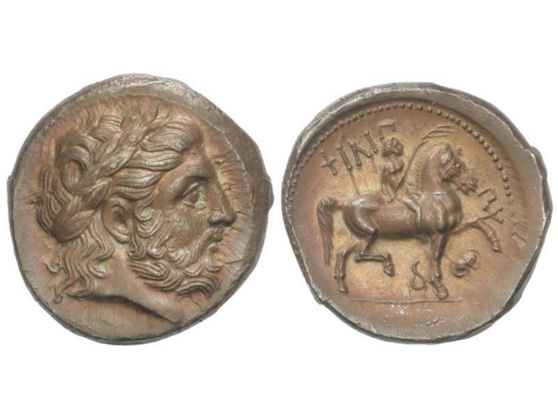 Tetradracma. 359–336 a.C. FILIPO II Acuñación postuma en tiempos de FILIPO III y KASSANDER. MACEDONIA. Anv.: Cabeza de Zeus laureado a derecha. Rev.: Jinete marchando a derecha, debajo serpiente y escudo. 14,29 grs. AR. Espectacular pátina de tonos irisados. BELLÍSIMA. Le