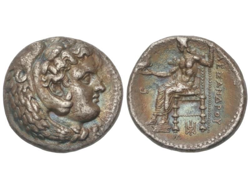 Tetradracma. 337-323 a.C. ALEJANDRO MAGNO. BABILONIA. Anv.: Cabeza de Hércules con piel de león a derecha. Rev.: Zeus entronizado a izquierda, llevando águila y cetro, debajo monograma, delante tridente y M. 17,02 grs. AR. Pátina irisada. Price-3635. EBC-.