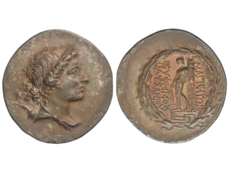 Tetradracma. 190-133 a.C. MAGNESIA. JONIA. Anv.: Busto diademado de Artemisa a derecha, a la espalda arco y carcaj. Rev.: Apolo en pie a izquierda apoyada su espalda en un trípode, alrededor leyenda. 16,80 grs. AR. Bonita pátina de colección antigua con preciosos tonos ca