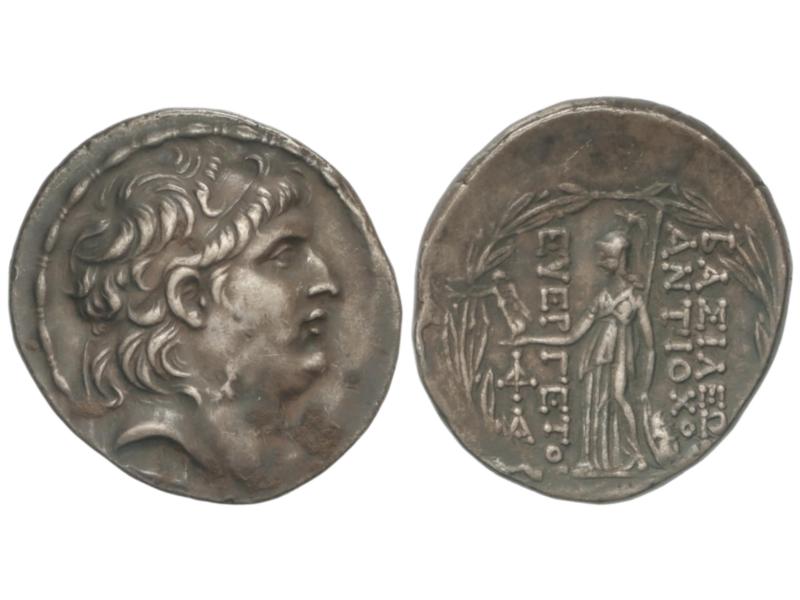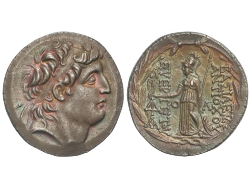 Tetradracma. 138-129 a.C. ANTIOCO VII. REINO SELÉUCIDA. Anv.: Cabeza diademada a derecha. Rev.: Atenea en pie a izquierda, sosteniendo a Nike, delante y detrás leyenda. 16,48 grs. AR. Bonita pátina de colección antigua irisada. HGC 9-1069; Se-7092 Sim. EBC.